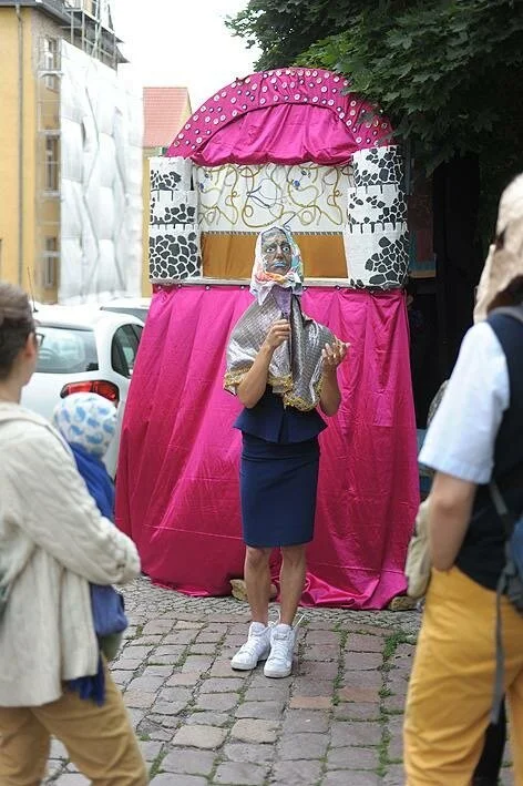“Bobe Mayses” is a mixed-media performance and parade. The dazzling show is based on a 500-year old Yiddish bestselling story about knights and fair ladies, the Bovo Bukh. It connects the story’s meanings with contemporary themes around grandmothers, migration and gender-bending heroes. The show was co-created at a four-week international artistic residency in Weimar.
